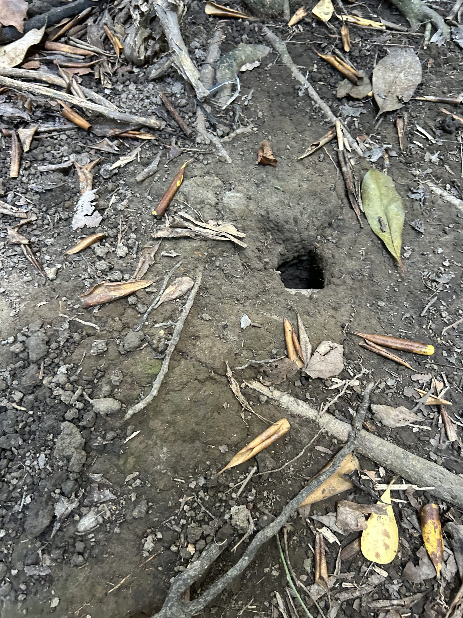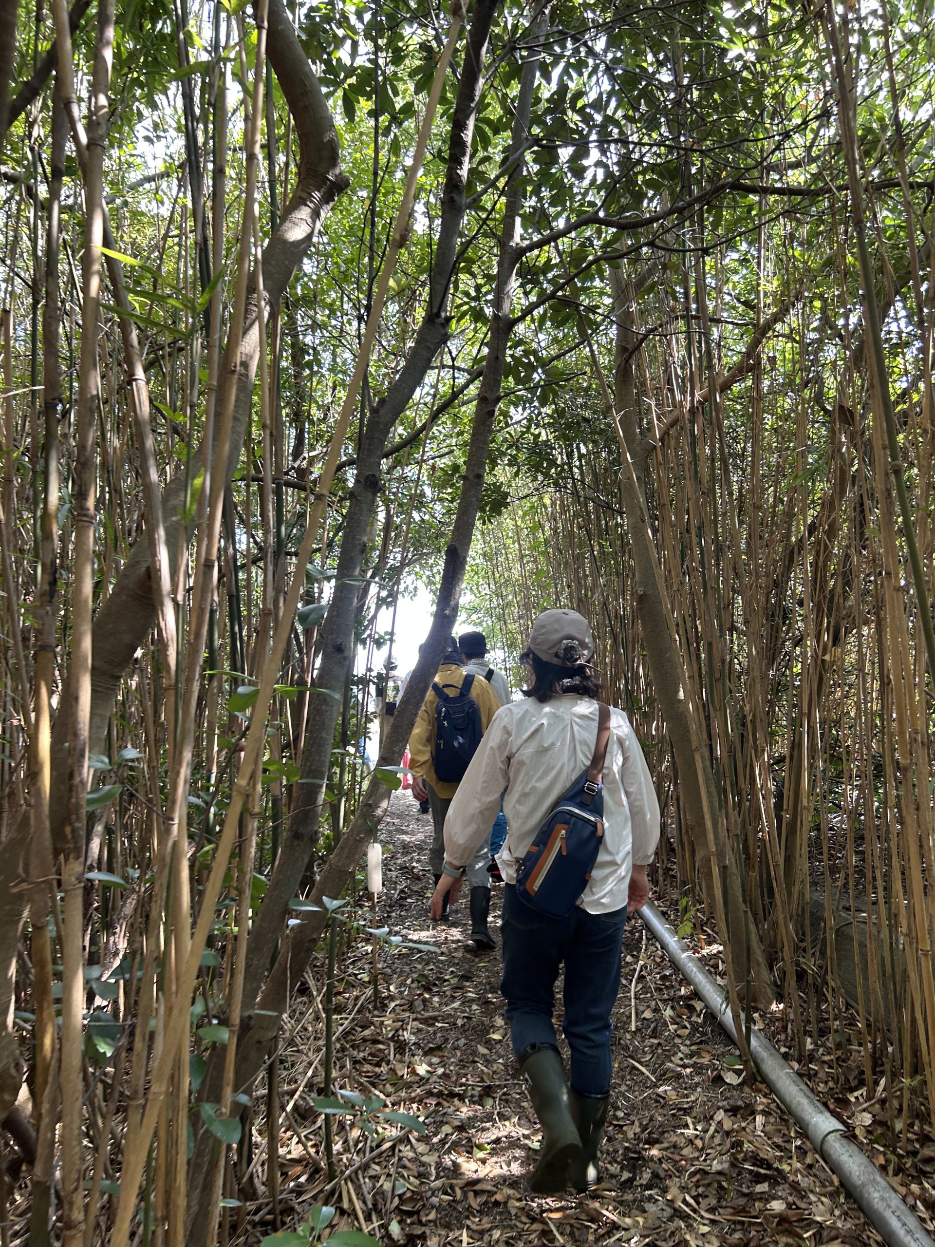 保護区内へ移動 集合場所から15分ほど歩いて、作業場所まで移動します。緑の中はずいぶん涼しく、鳥の声がよく聞こえる気がします。途中でカニの脱皮跡を見つけたり、カニの巣穴を見たり、いきもの観察をしながら進んでいきます。なんとカニは20種類以上いるそう!