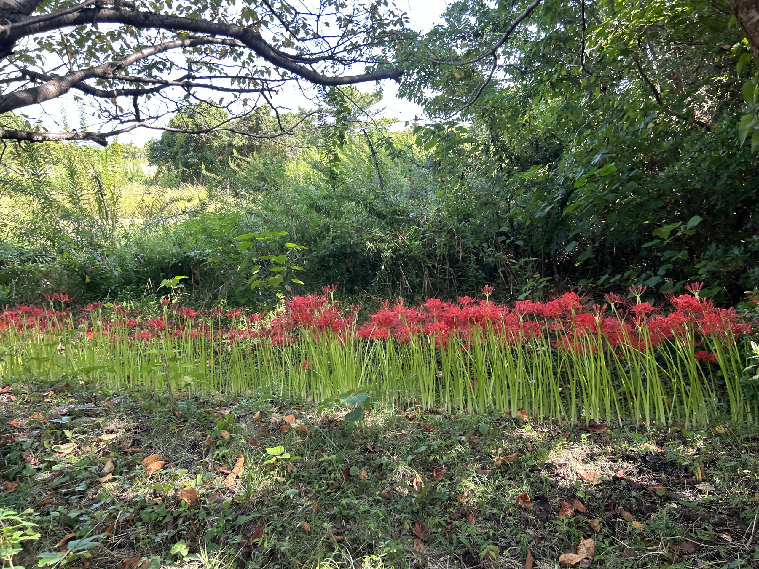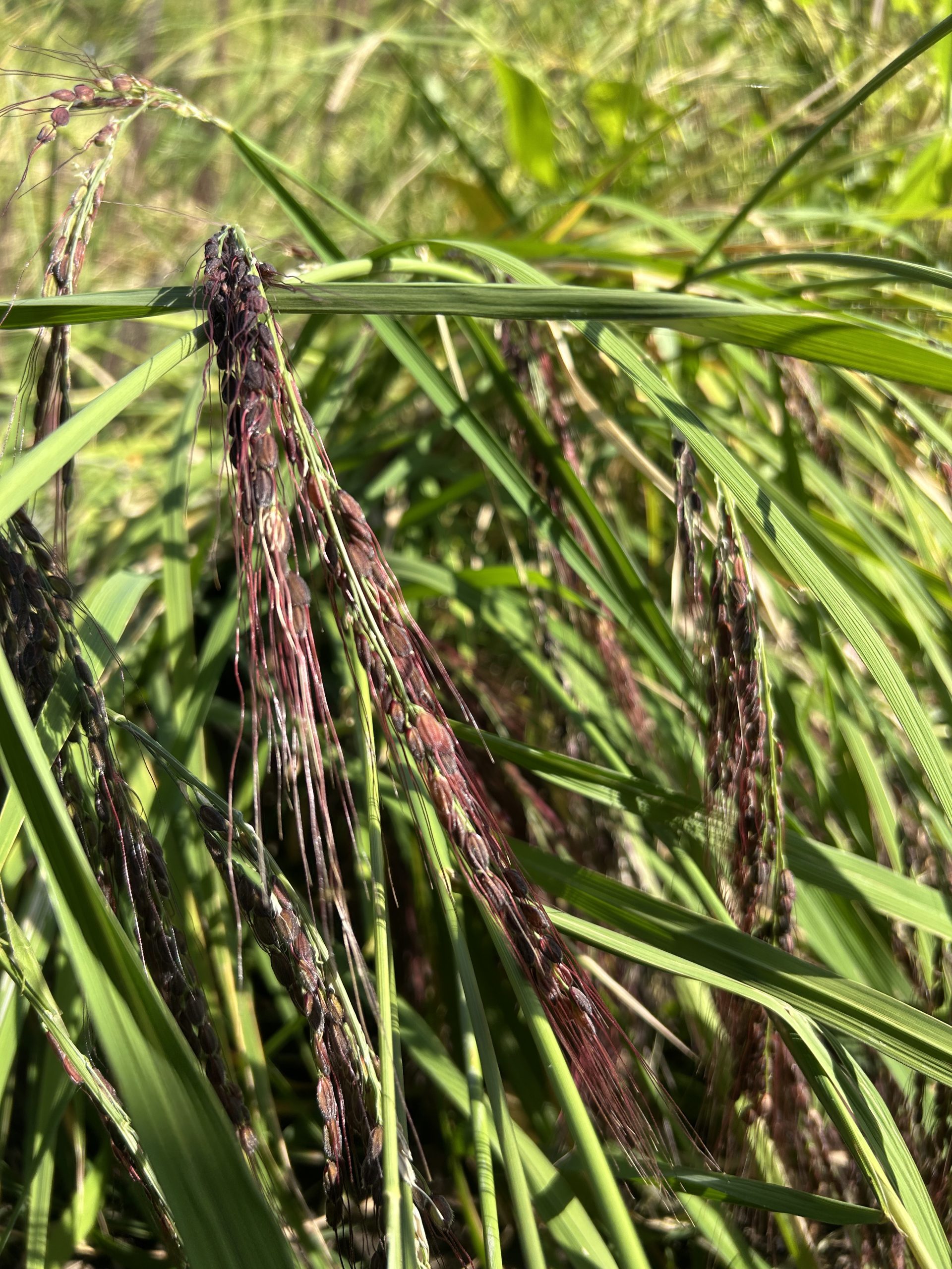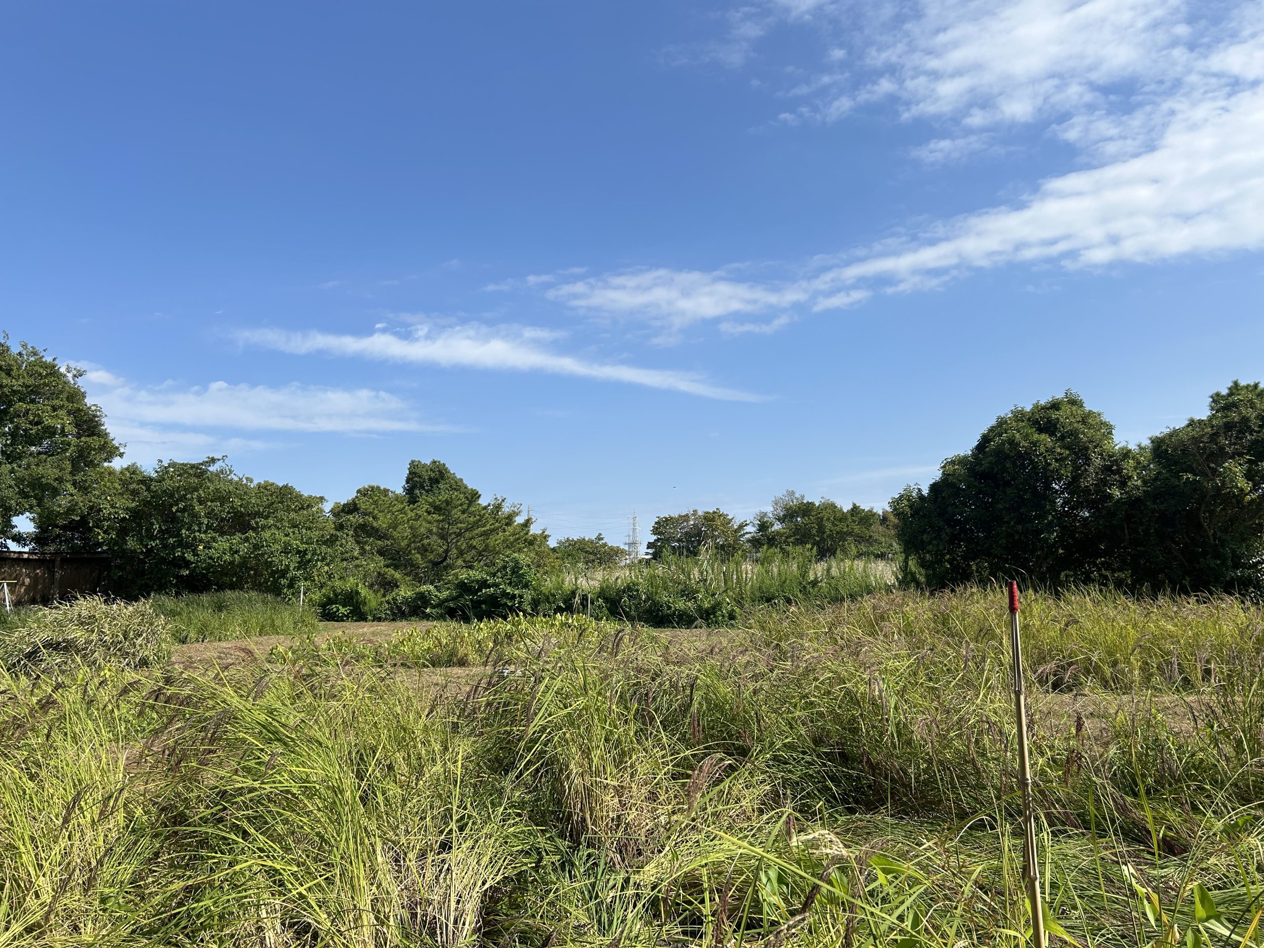 青空のもと13時集合、レクチャー 集合場所は、行徳保護区管理事務所前。最寄りのバス停から歩く間に緑のトンネルに包まれ、たくさんの鳥の姿も見られました。9月末とはいえ日差しが強く、少し歩いた木陰に移動して全員そろうのを待ちました。 時間になるとスタッフの方が、配布資料を使いながら保護区について説明してくださいます。60年前の地図には保護区がなく、あるのは海。埋め立てての都市開発が進む中、そこに暮らす野生生物を守るために人工的につくった場所なのだそうです。昔からいる生き物が住める場所にするために、区域内にたくさんある池の一角に稲を毎年植えて、水田をつくっているとのこと。今年の5月には、赤米・黒米・緑米という3種類の古代米の稲を植えたそうで、今日はその稲刈りをします。