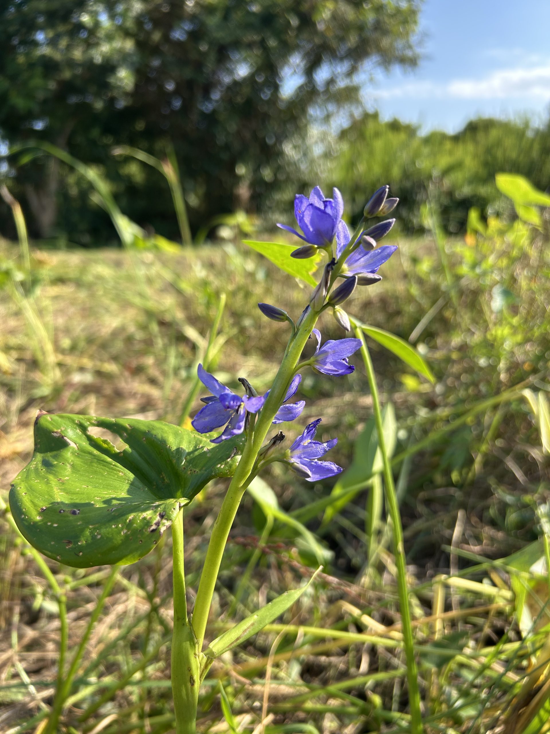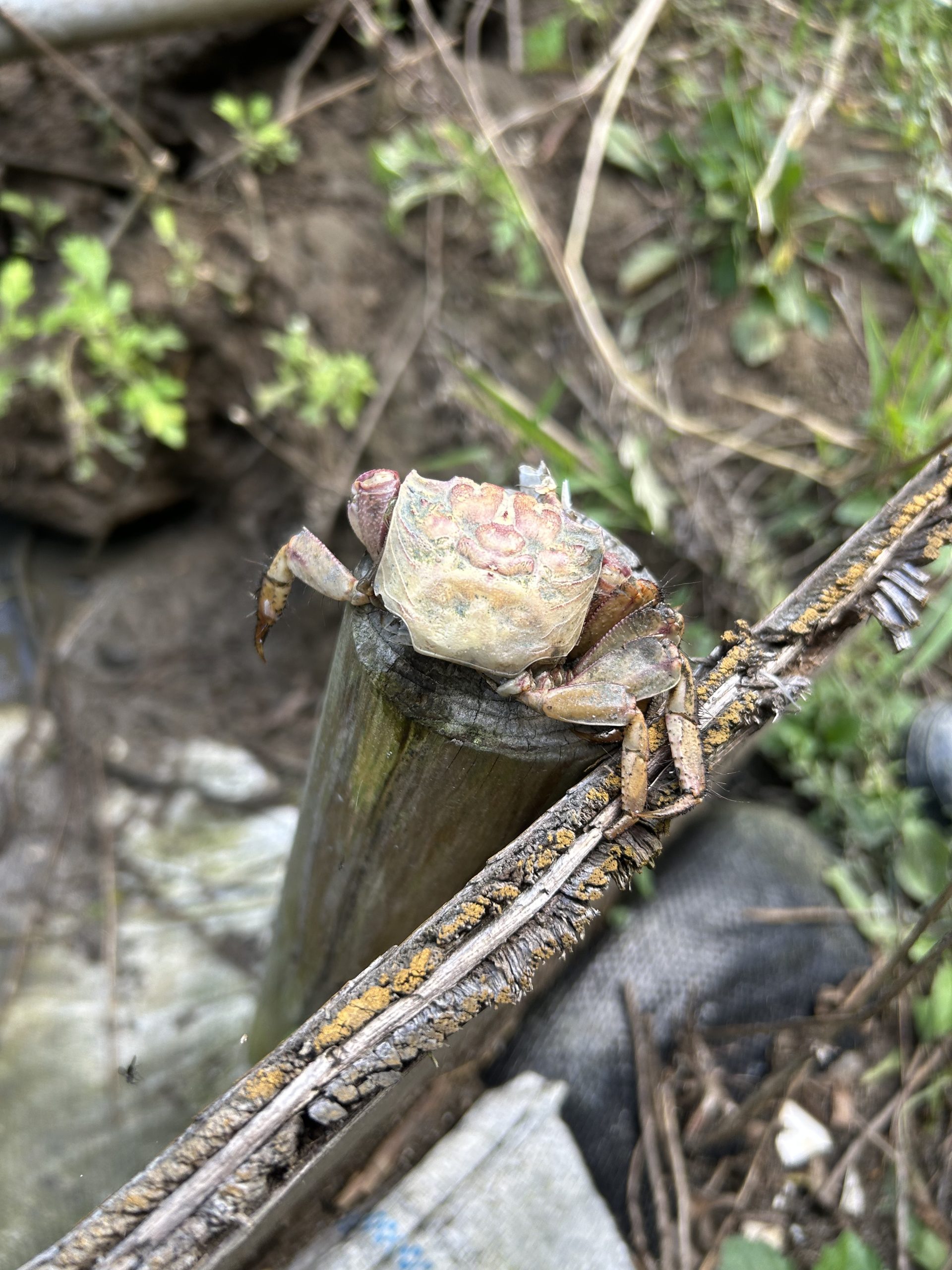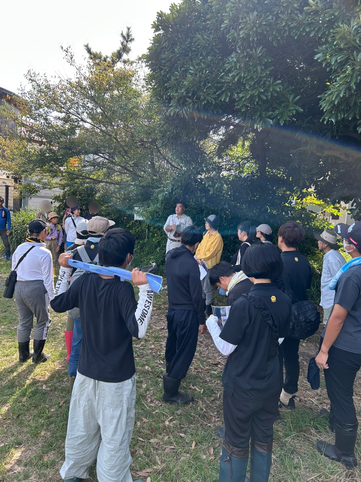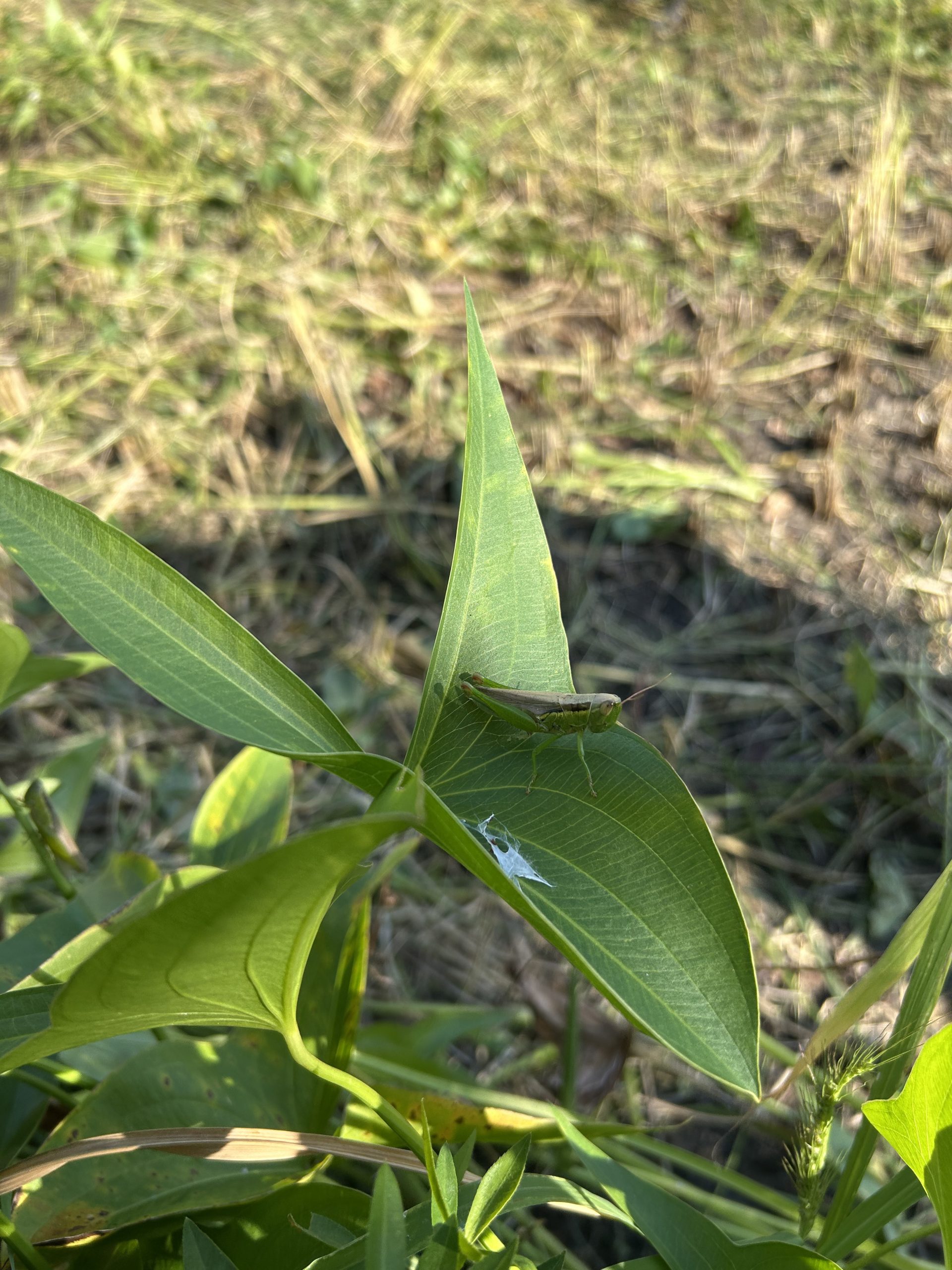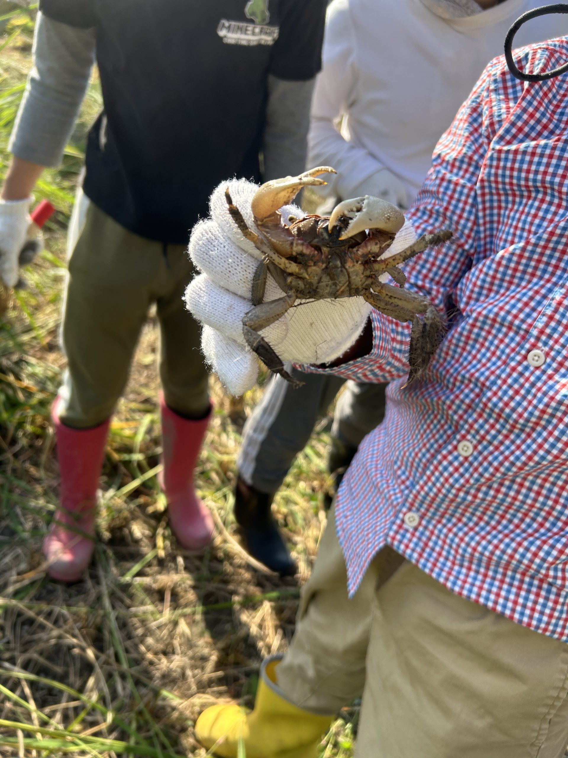 途中、木陰での休憩をはさんだり、絶滅危惧種のミズアオイという花を教えてもらったり、遠くで鳴くモズを観察したり、バッタやカニを見つけたり。