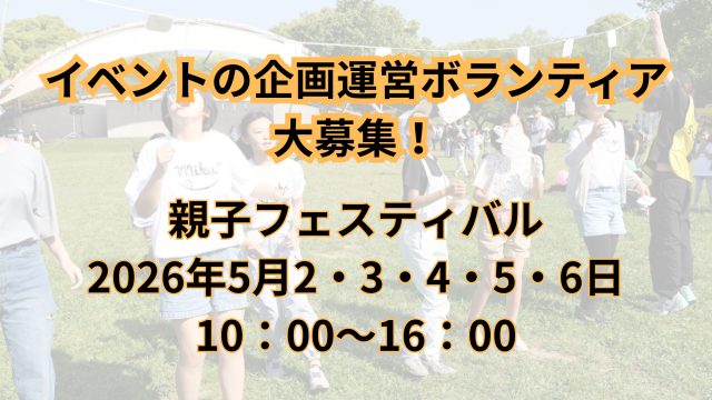 「親子フェスティバル」 2026年5月2・3・4・5・6日 10:00~16:00 千葉ポートパーク円形芝生広場 入場料、体験料無料のイベントを実施します! 1日中遊べるイベントを通して多くの子育て世帯を笑顔にするため…