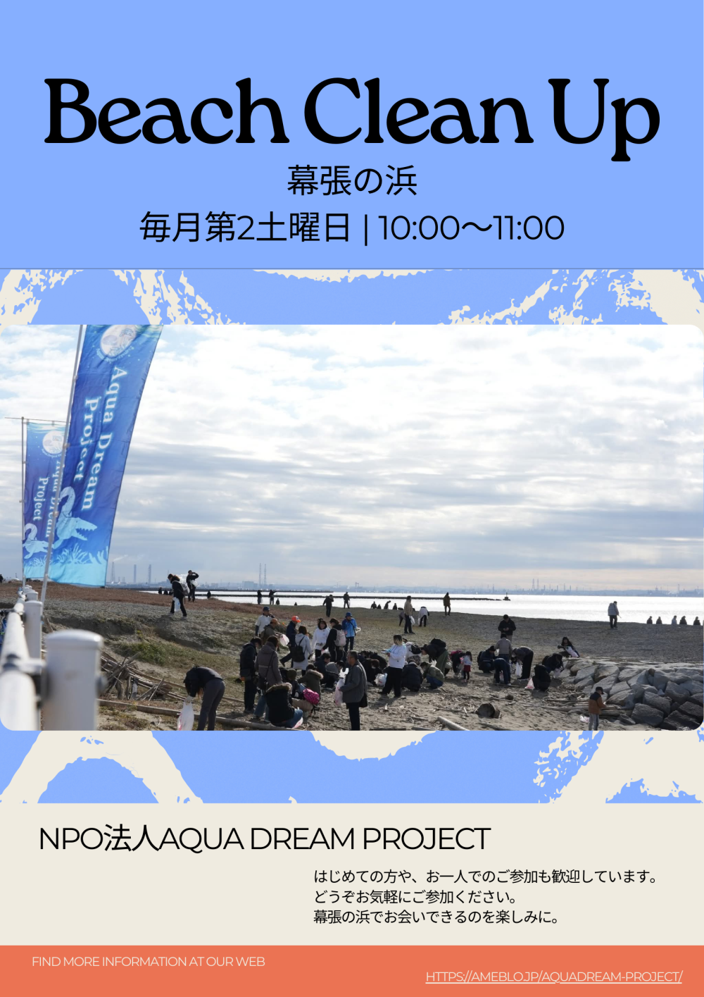 | 団体・事業の紹介 | Beach Cleanup|幕張の浜 はじめての方や、お一人でのご参加も歓迎しています。 必要事項をご入力のうえ、お気軽にお申し込みください。 ▶ 参加申込み https://forms.gle/t2wtgdSJ4BL4XiuR7 主催|NPO法人 Aqua Dream Project 日時|毎月第2土曜日 10:00–11:00 場所|幕張の浜 集合|JFA夢フィールド クラブハウス前(9:45) ※雨天等により中止となる場合は、前日19時までに専用サイトでお知らせします。 お問い合わせ aquadream.project@gmail.com | |