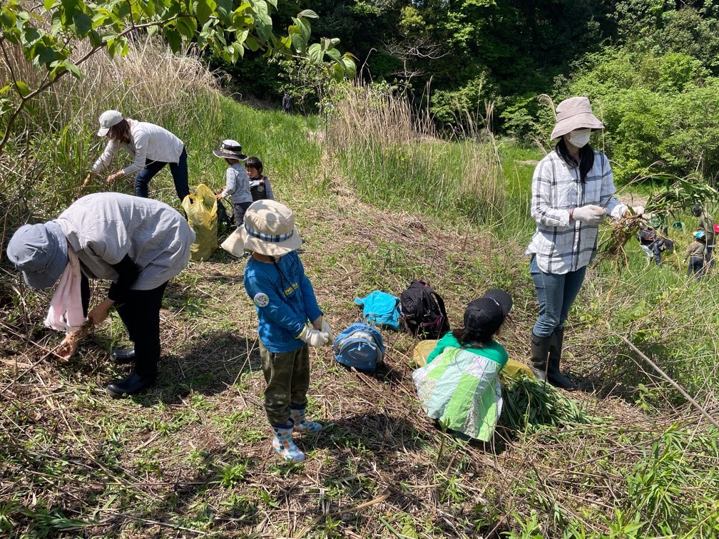 湿地に繋がる原っぱにはびこるセイタカアワダチソウを引っこ抜き、熊手で草や枯れ枝を集めて原っぱを集めて花が咲く