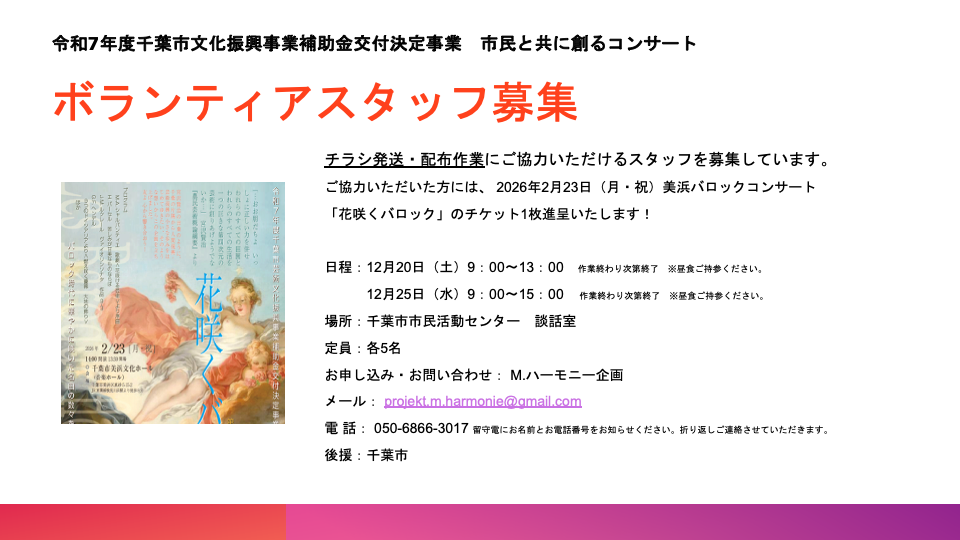 ご協力いただいた方には、 2026年2月23日(月・祝)美浜バロックコンサート「花咲くバロック」のチケット1枚進呈いたします! |